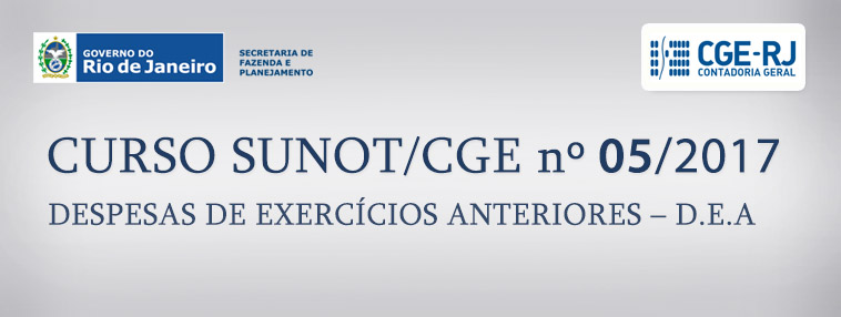 Nos dias 20/04/2017 e 25/04/2017 será realizado o 5º Curso SUNOT/CGE voltado a servidores/empregados públicos do Governo do Estado do Rio de Janeiro. O curso abordará o assunto “Despesa de Exercícios Anteriores – Análise da Nota Técn