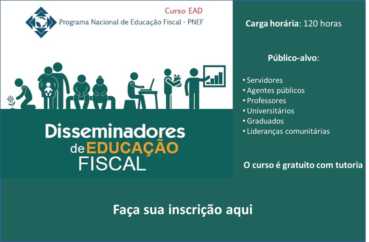 O Curso de Disseminadores de Educação Fiscal, oferecido pela ESAF e coordenado pela Secretaria de Fazenda, através da Divisão de Educação Fiscal da Escola Fazendária, abre suas inscrições a partir do dia 14 de agosto, se estendendo at