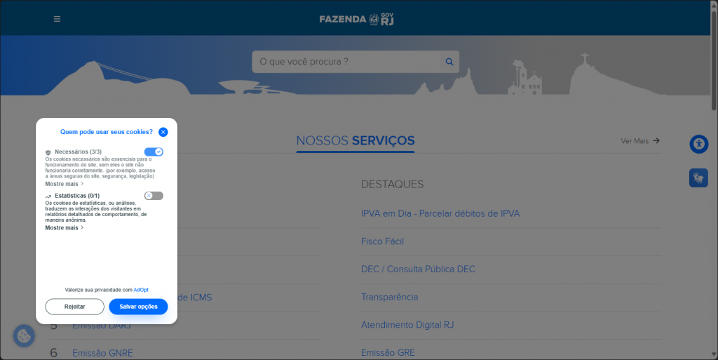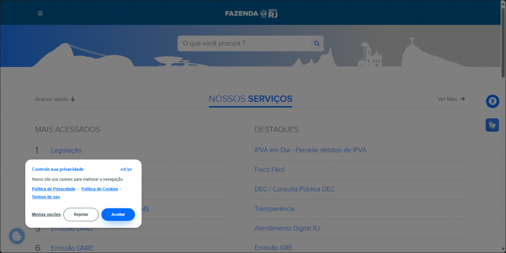 | Cookies Opcionais (análise e estatística) | Os cookies analíticos ajudam a SEFAZ-RJ a entender como os visitantes interagem com nossos portais. Isso nos permite implementar melhorias contínuas na experiência dos usuários. Esses cookies são coletados apenas se você consentir e coletam dados de forma anônima. |